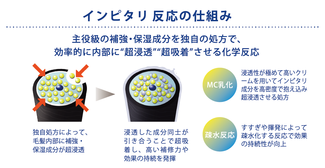 独自処方によって最新の主役級成分が「超浸透」「超吸着」して、毛髪を徹底的に補修する化学反応。
